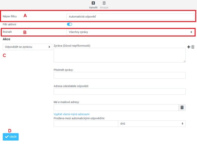 Vyplníte Název filtru(A), Pro přicházející poštu zvolíte možnost všechny zprávy(B). V časti, …vykonat tyto akce zvolíte možnost Odpovědět se zprávou(C), též vyplňte, prosím, Zprávu (obsah zprávy) a Předmět zprávy. Jako poslední stačí kliknout na Uložit(D).