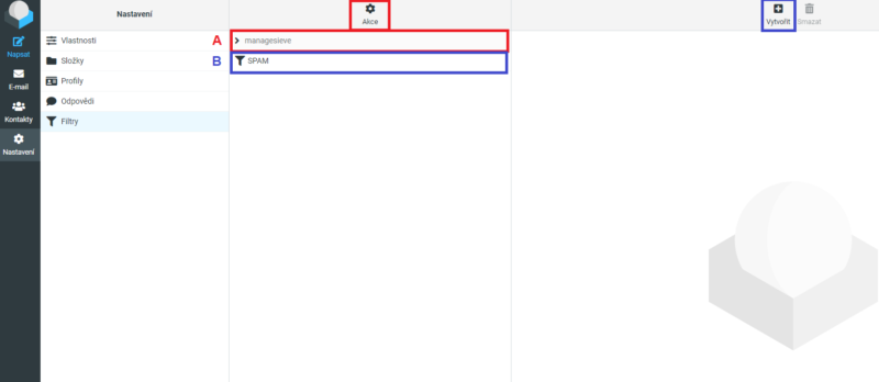 Tato stránka je rozdělená na časti Souprava filtrů(A) a samotné Filtry(B). Soupravy filtrů vytvářet/editujete kliknutím na možnost “akce” a nový filtr přidáte po kliknutí na možnost “vytvořit”.
