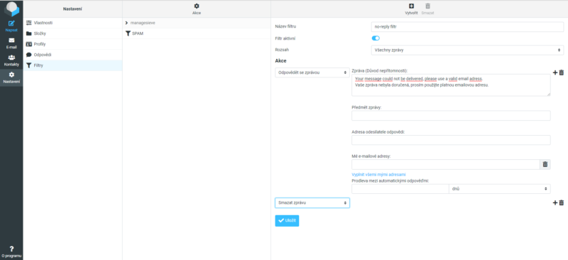 Když Vám někdo napíše na no-reply email a chcete mu o tom dát vědět, můžete nastavit na schránku následující filtr: