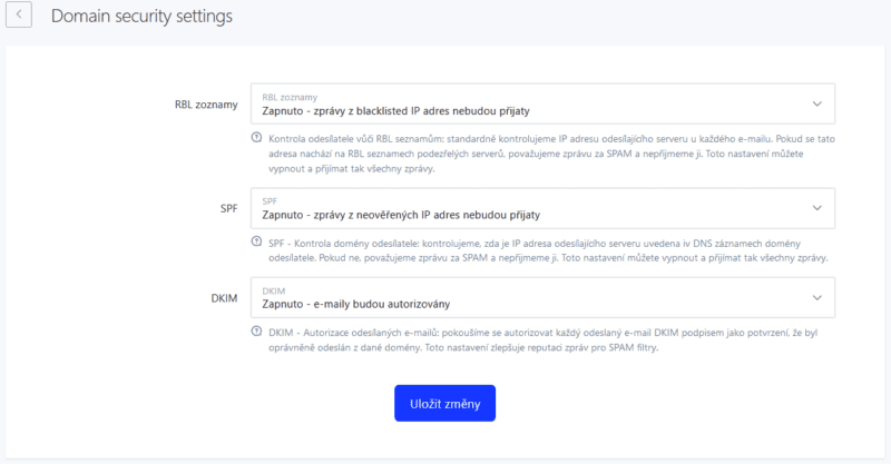 - V části Autorizace odesílaných emailů DKIM můžete ze seznamu vybrat možnost nastavení zapnuté nebo vypnuté