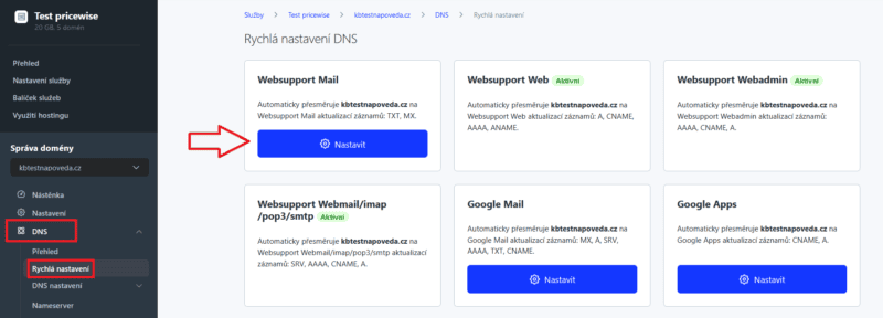 - Klikněte na možnost Websupport Mail – v přehledu záznamů se Vám zobrazí název začínající na: mail._domainkey.