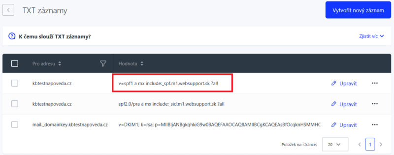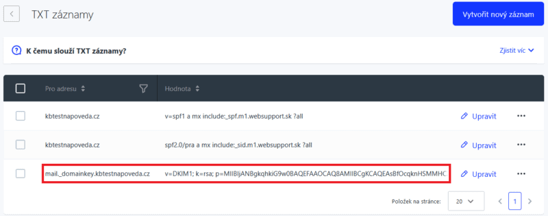 Pokud DKIM v seznamu TXT záznamů není vidět, můžete ho opětovně přidat: