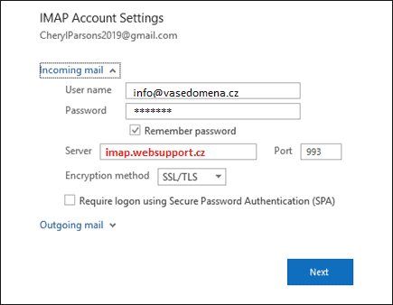 Server: imap.websupport.cz (příp. pop3.websupport.cz pro POP3)